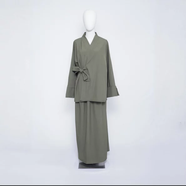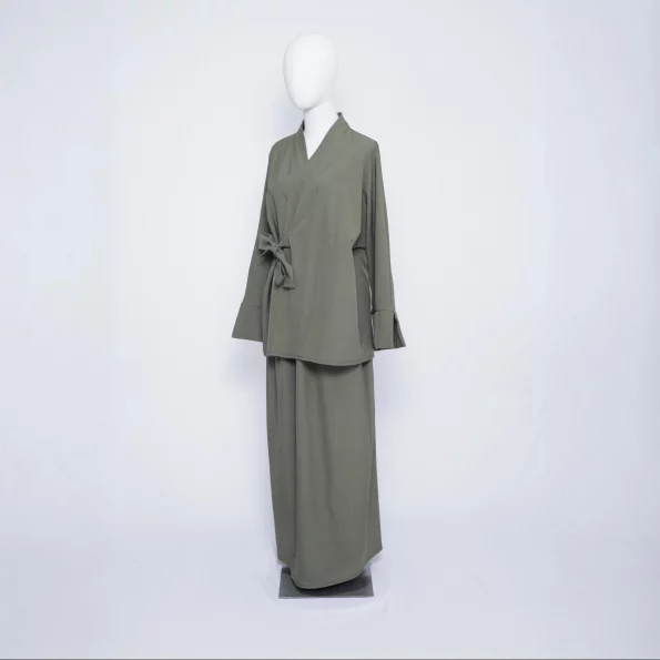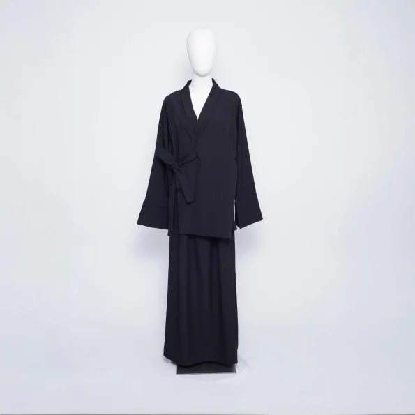 L’ensemble se compose d’une jupe et d’un kimono cache-cœur